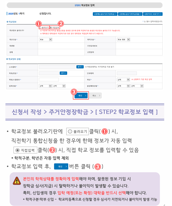STEP2: 학교정보 입력 단계에서, 자신이 다니는 대학의 정보를 입력합니다. 만약 대학정보가 자동으로 불러와지지 않으면, 직접 학교 정보를 입력할 수 있습니다. 학교 정보 입력 후 확인 버튼을 클릭합니다.